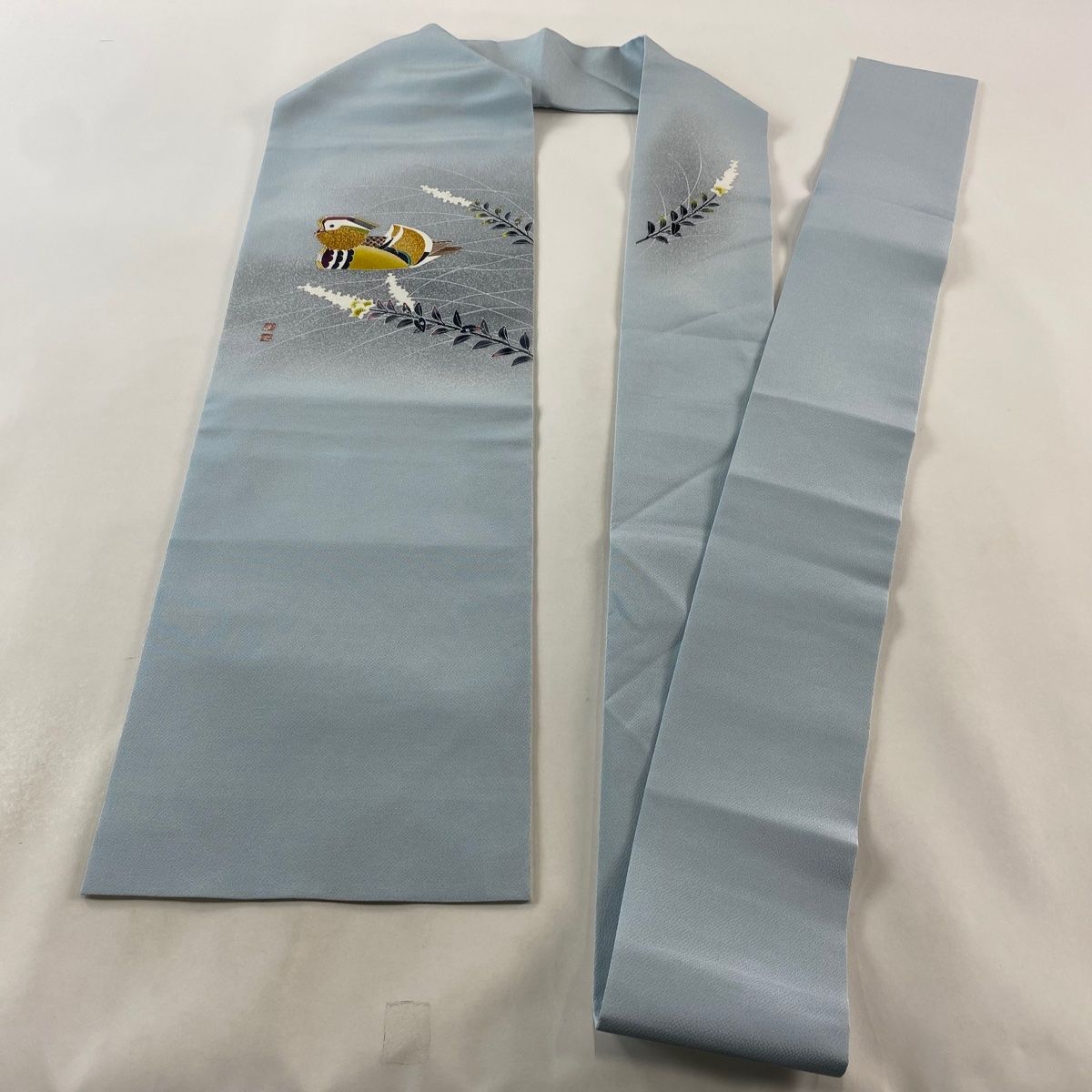 名古屋帯 人間国宝 羽田登喜男 落款 鴛鴦 草花 金銀彩 ぼかし 水色 正絹