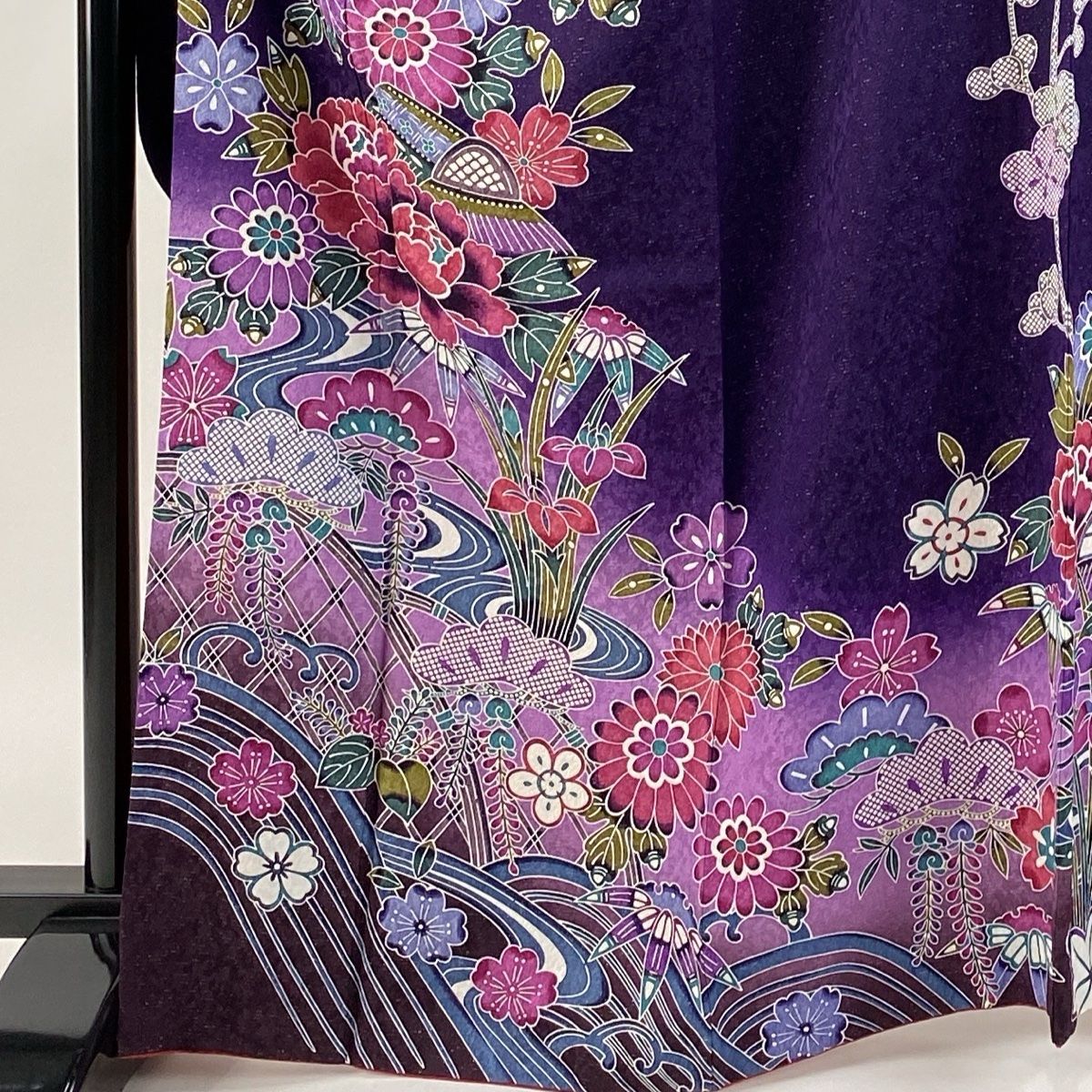 振袖 身丈167 cm 裄丈66.5 M 袷 鈴乃屋 草花 流水 銀通し ぼかし 紫 正絹