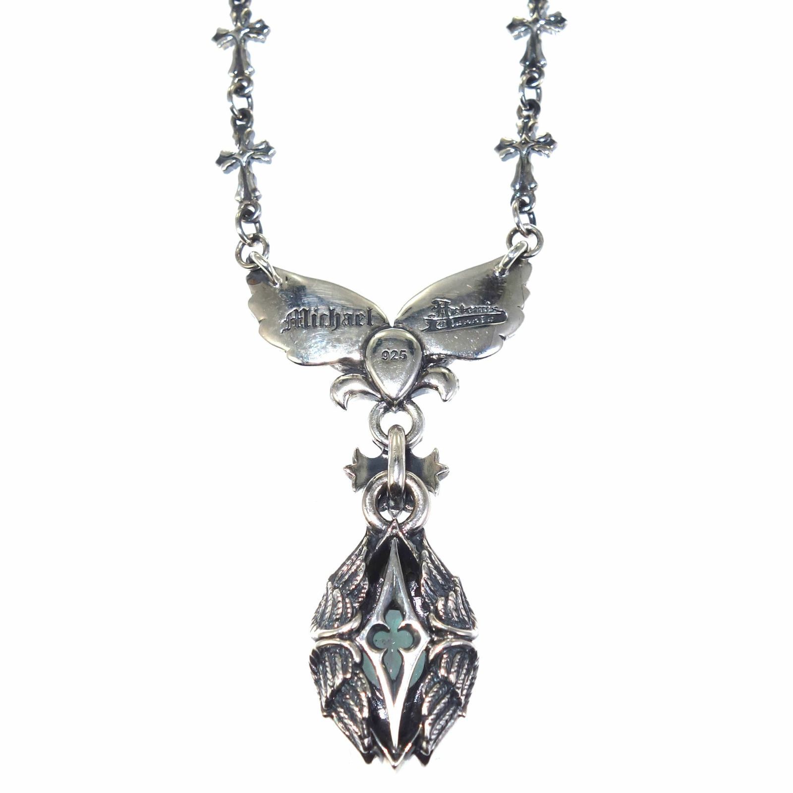翼とクロスを基調に大天使ミカエルの威厳を映したハイライン・ペンダント。センターには神秘の虹彩を放つミスティッククォーツを配し、角度で色が移ろう万華鏡の輝きが胸元に聖なるオーラを添えます。贅沢に用いたSV925には繊細な彫りを丹念に施し、鏡面×燻しのコントラストが荘厳な立体感を強調。クロスがリズミカルに連なるチェーン、エンドにあしらった金メッキのダガーチャームが気品ある差し色に。背面には“Michael”と品質刻印。翼は飛躍と上昇の象徴──装いに力強さと気高さを与えます。適度な重量と滑らかな裏面仕上げで、長時間の着用も快適。石留めから最終ポリッシュまで、ブランドと提携アトリエの技術が結実した、こだわりの一点です。単体で主役、重ねても美しい、アートピースの風格を纏う一本。