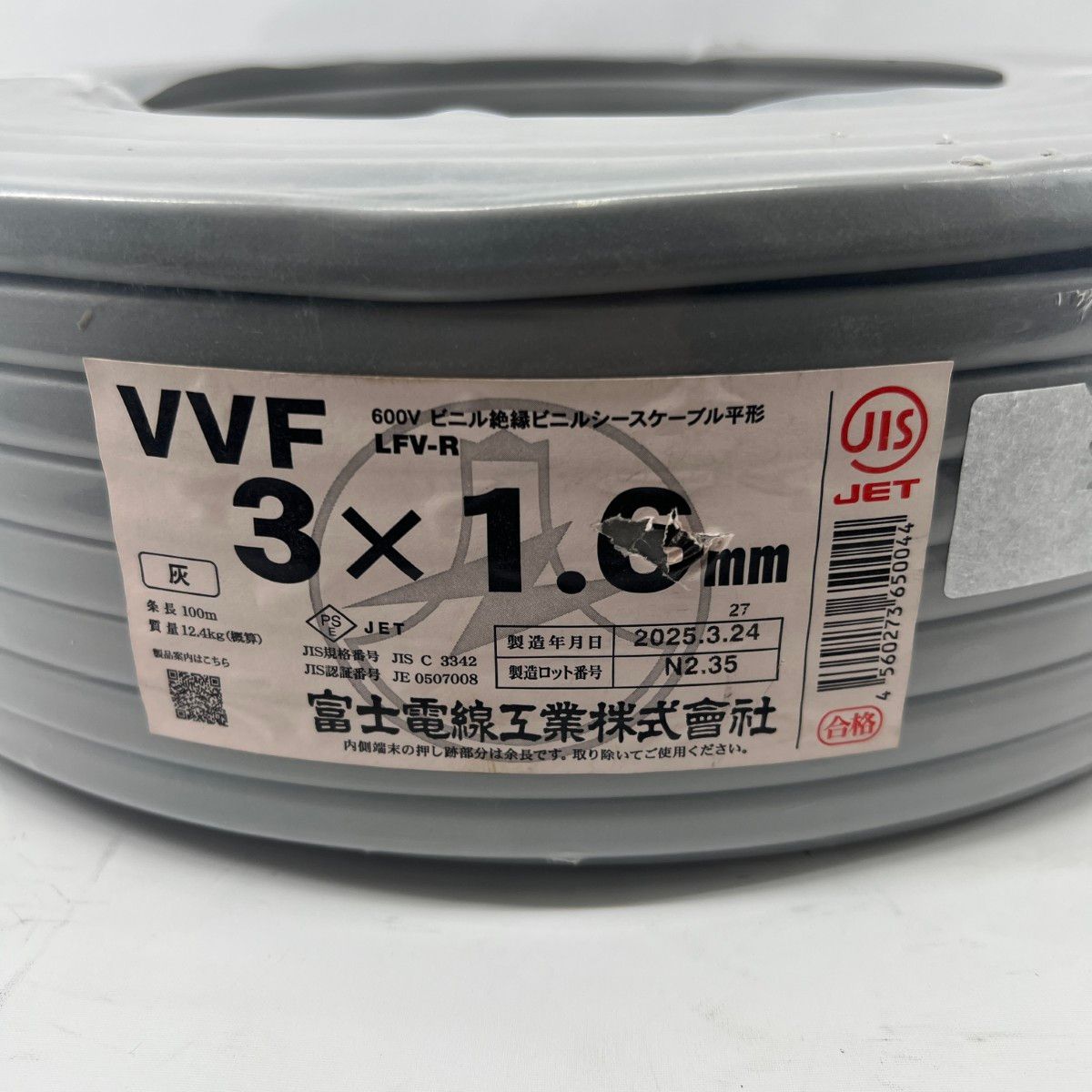 【商品名】新品 富士電線工業 電材 VVFケーブル 3芯 3× 1.6 LFV-R 100m 未開封品 グレー 2025年3月(令和7年)製造