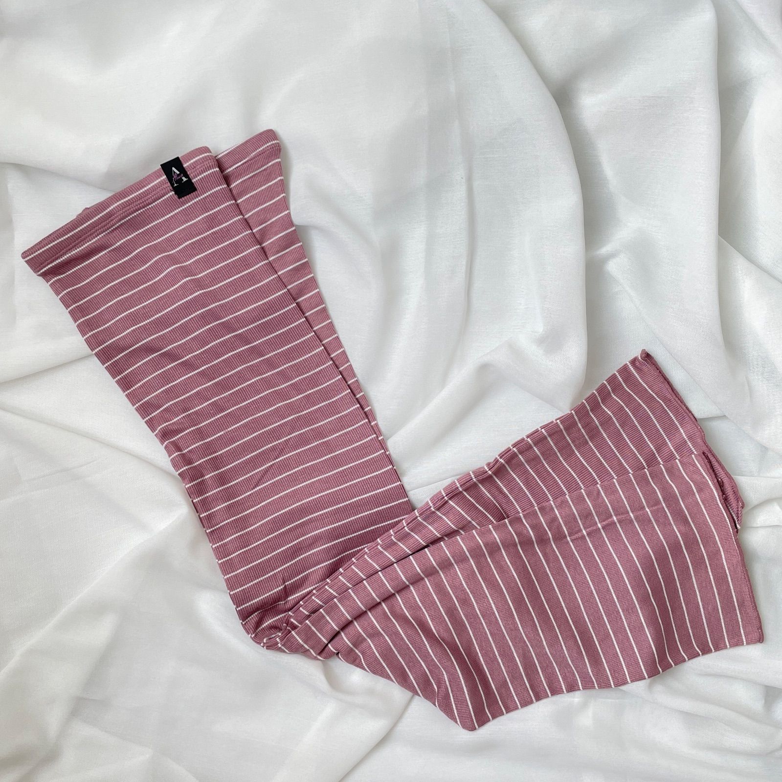ローズカラーのニットトップスとレッグウォーマーの組み合わせ