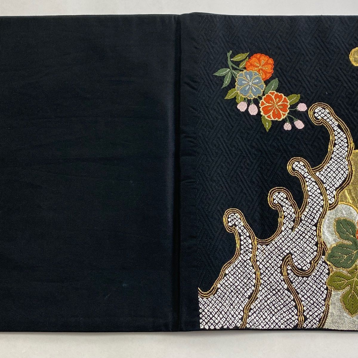 袋帯 秀品 関西仕立て 菊 波頭 箔 金糸 黒 六通 正絹