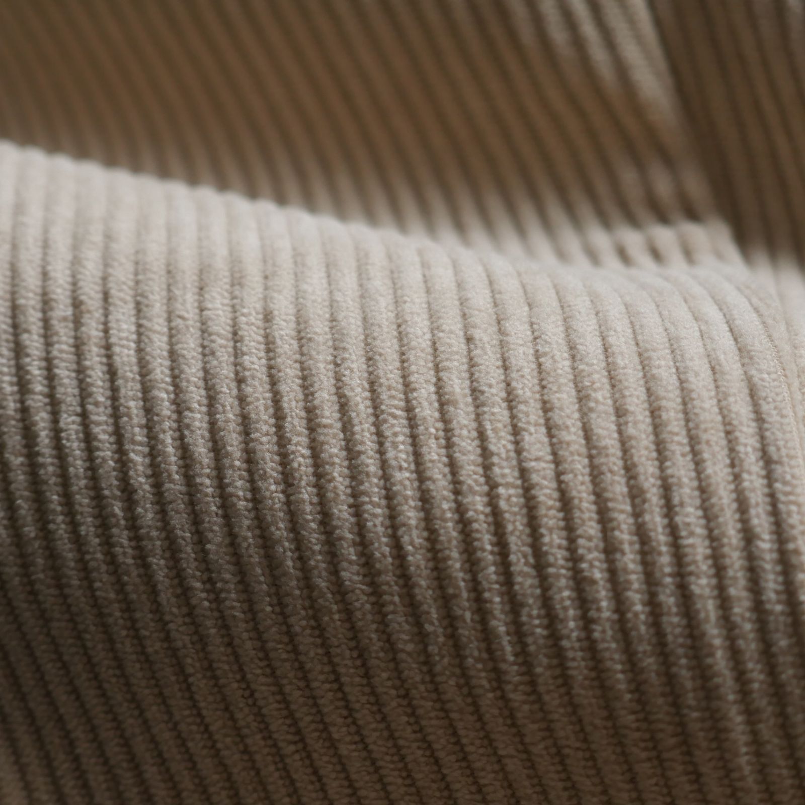 ●上品な畝が特徴の細畝コーデュロイ生地を使用し、柔らかな質感としなやかなドレープ性を兼ね備えた上質な仕上がりです。適度な厚みを持ちながらも軽やかで、秋冬シーズンに快適な穿き心地を実現しております。見た目にも高級感がありながら、動きに合わせて自然な光沢を放つ素材感が、洗練された印象を与えます。
