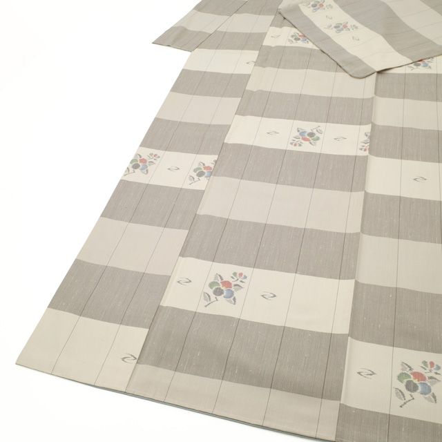 紬 着物 正絹 袷 十日町 白磁 伝統工芸士 庭野真平 作 オフホワイト ライトグレー 格子 椿 つばき 花 カジュアル 春 秋 冬 つむぎ 仕立て上がり 身丈167 裄丈68 Lサイズ みやがわ sb 16510