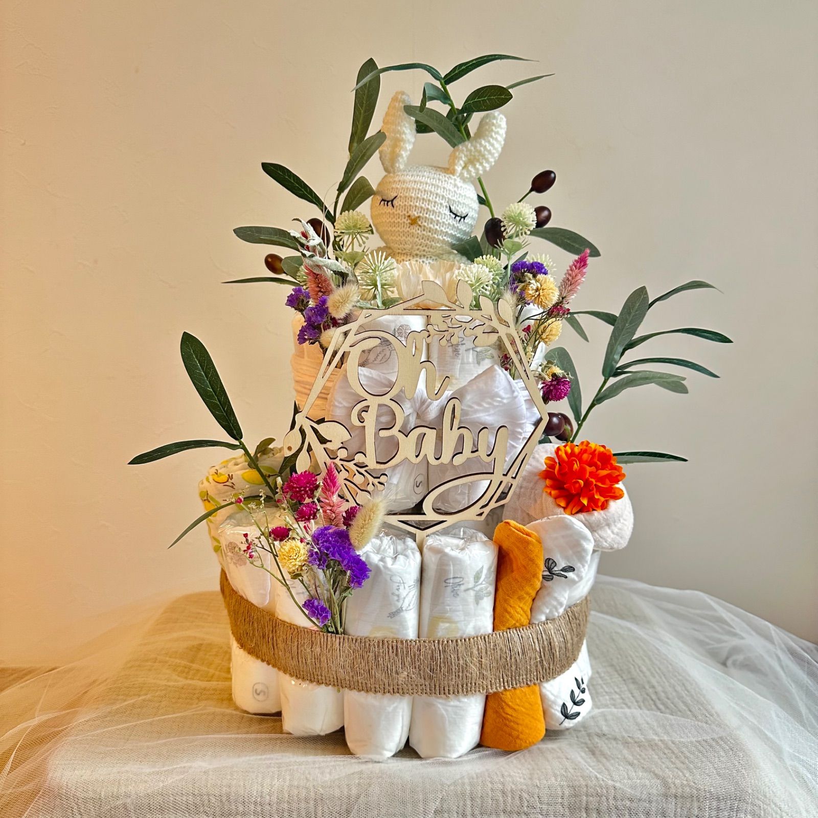 オムツケーキ ドライフラワーとオリーブうさぎ