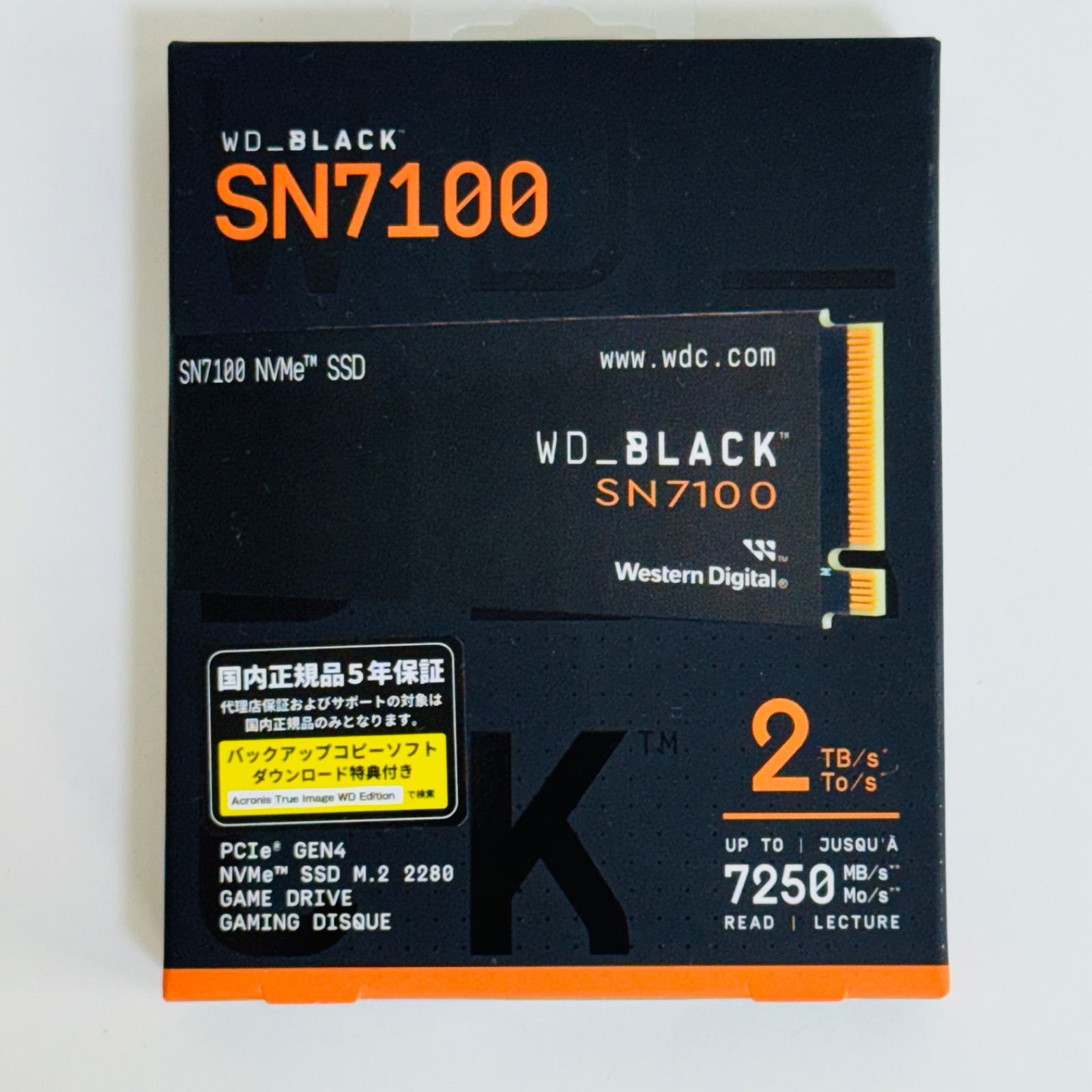 WDS200T4X0Eは、Western Digitalのゲーミング向けM.2 NVMe内蔵SSD「WD_BLACK SN7100」シリーズの2TBモデルです。PCIe Gen4x4インターフェースを採用し、最大読み取り速度7,250MB/s、最大書き込み速度6,900MB/sの高速性能を持ちます。ヒートシンクは非搭載ですが、コンパクトなM.2 2280フォームファクターで高性能を実現しています.