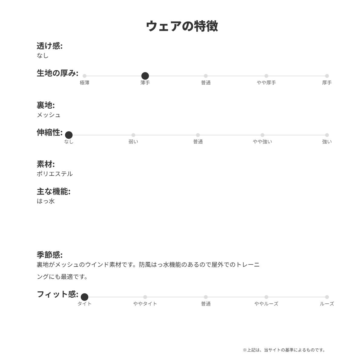 先進の3Dフィットテクノロジーにより自由な動きを追求する・防風性/優れたはっ水機能を追求したポリエステルタフタ素材を使用・裏地のメッシュが汗によるベタつきを抑え、快適性を追求・裾には着脱しやすいようにファスナーを採用