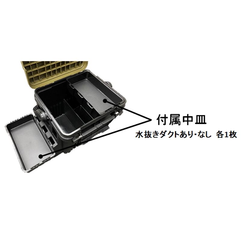 ●ワンタッチ開閉バックル・滑り止めゴム、中皿(水抜きダクトあり・なし)2個、仕切板2枚を装備
