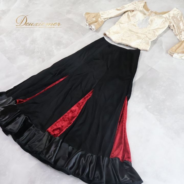 #フラメンコ #衣装 #セットアップ #ツーピース #ファルダ #女性用 #ダンス衣装 #ベロア素材 #おしゃれ #大人っぽい #高級感 #背面ファスナー #伸縮性無し #肩パッド無し #胸パッド有り #総丈 #ウエストサイズ #舞台衣装 #プチプラ #ENUTSU