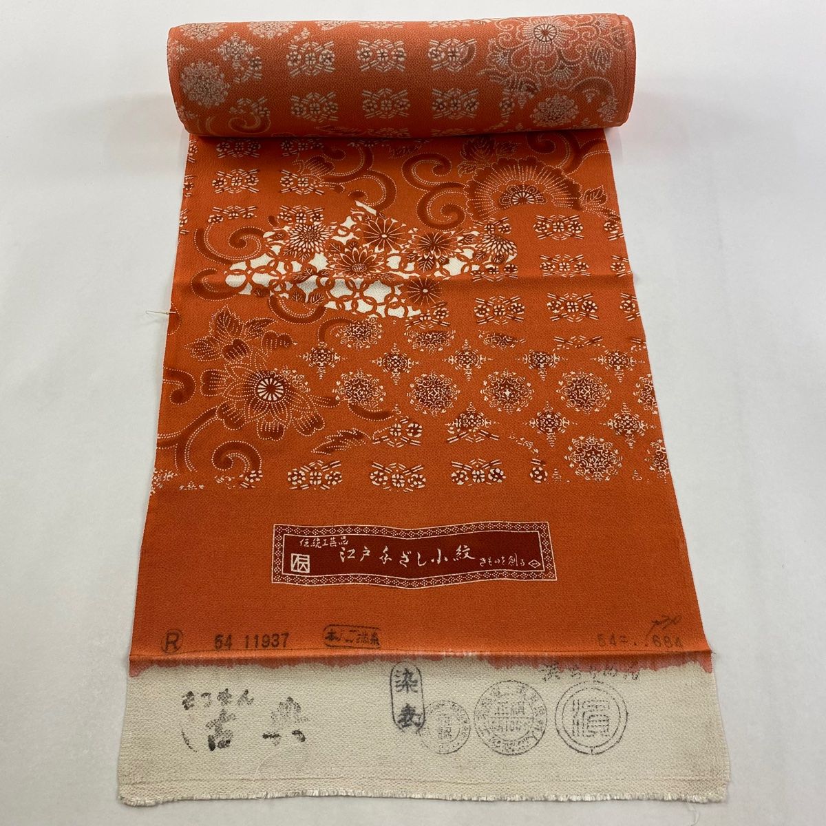 反物 秀品 小紋 落款 華文 菊 縮緬 オレンジ 正絹