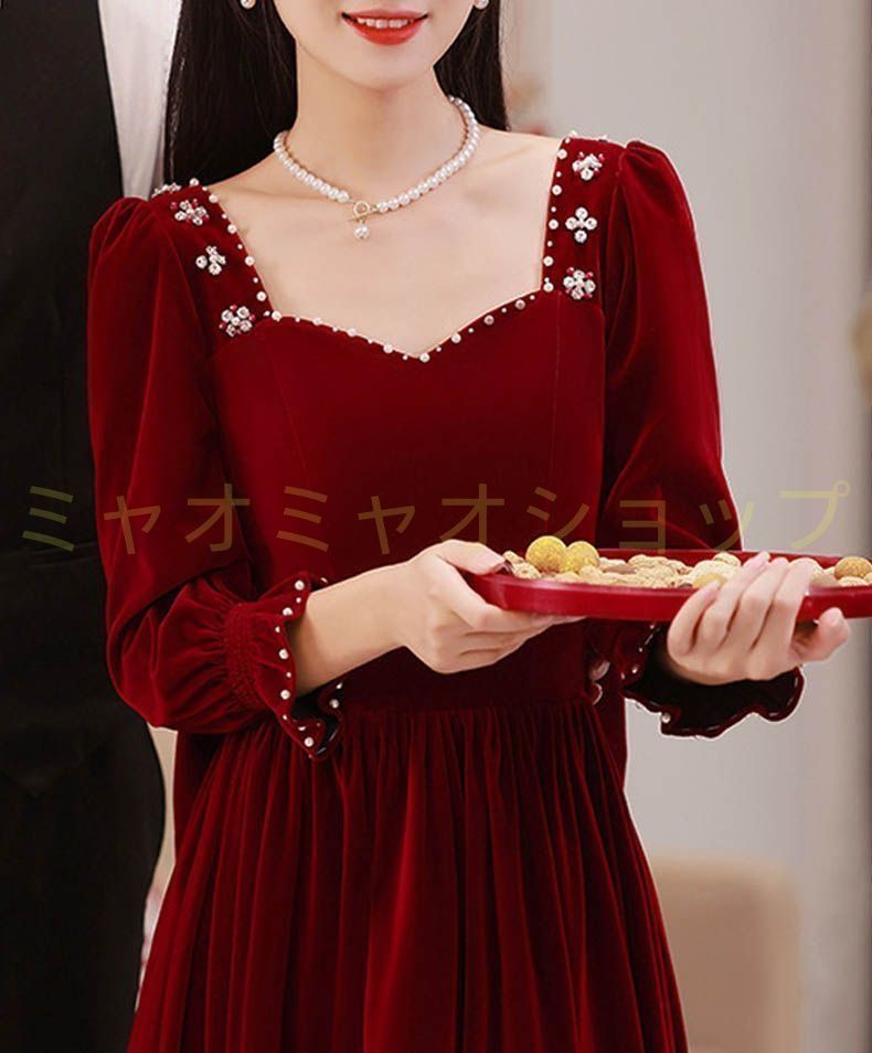カラードレス Aラインドレス 袖あり 長袖 ベルベット ロングドレス 赤 レッド ウェディングドレス 結婚式 二次会 花嫁 前撮り 演奏会 発表会 ステージ衣装 パーティードレス 1249