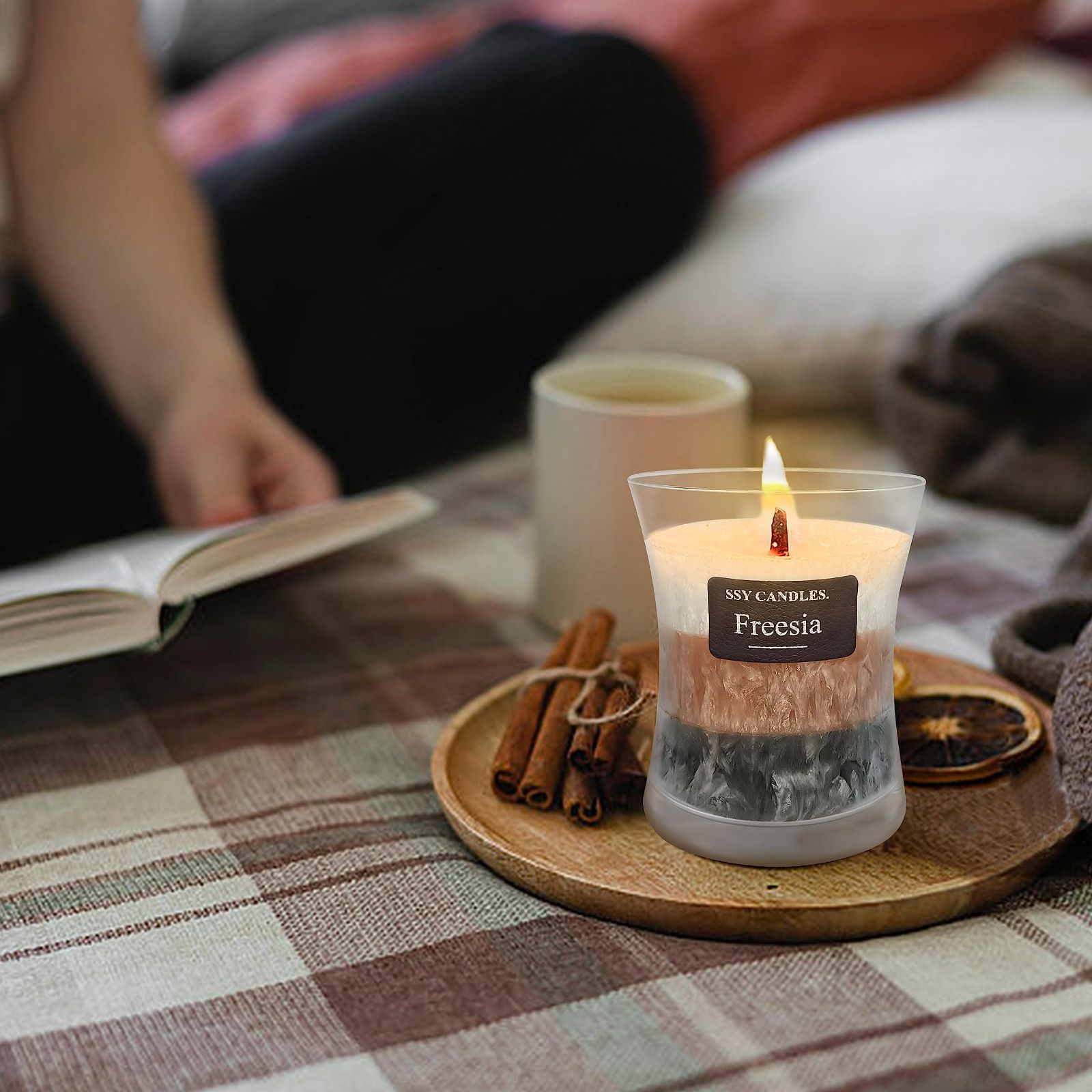 パチパチ音 ギフト フレグランス 3層の ガラスの瓶 木の芯 ロウソク black-brown-white ろうそく アロマ フリージアの香り ジャーキャンドル L アロマキャンドル FCMSHAMD