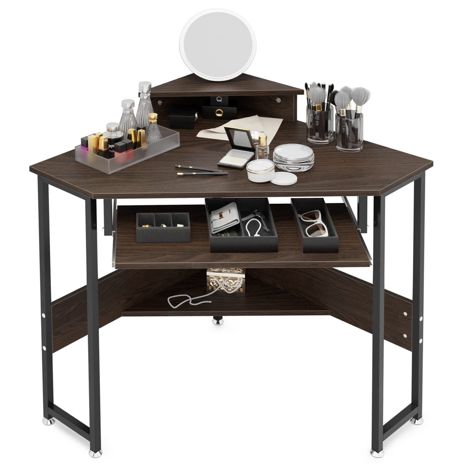 DEWEL デスク 机 コーナーデスク スライダー付き 高さ75cm 卓上台*下棚付き 幅72cm 奥行72cm PCデスク 三角つくえ 学習机 化粧台 鏡台 省スペース 在宅勤務 テレワーク 寝室