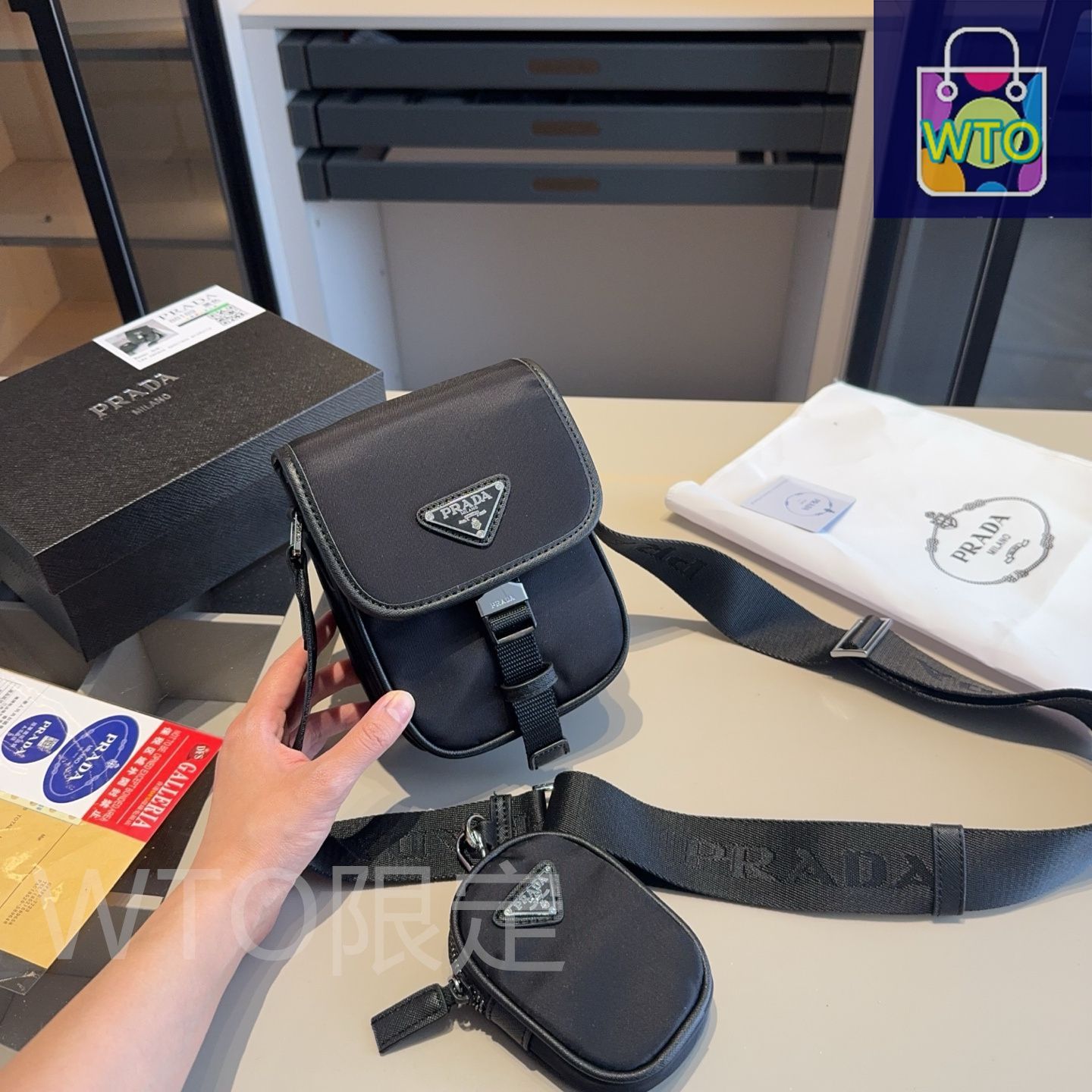 本日限定特別割引!プラダの新作メンズクロスボディバッグが登場!携帯電話も収納可能で、肩掛けもできる便利なデザインです。コインケース付きで、単体でも使用可能!防水布とレザーの組み合わせで、耐久性も抜群です。クラシックなロゴと高品質な仕上げで、長く愛用できるアイテムです。