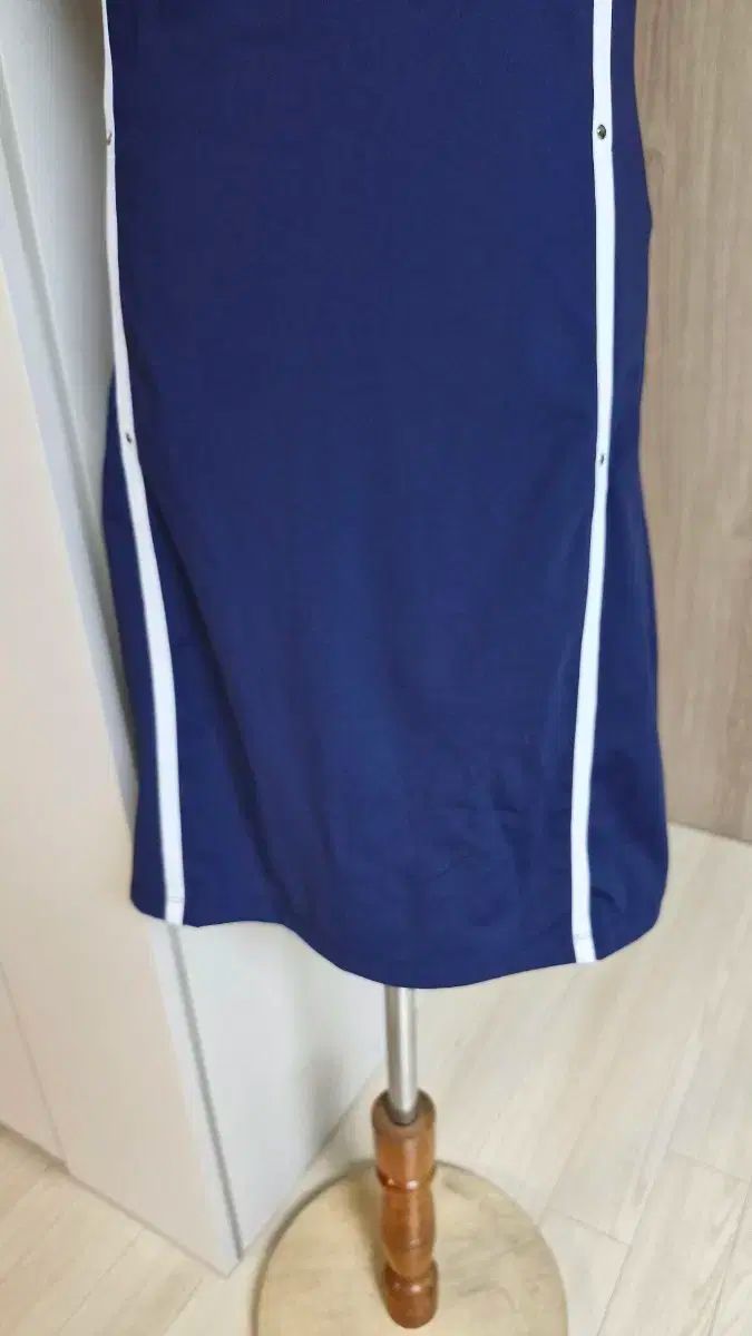 これはネイビーカラーのPXGゴルフノースリーブドレスです。サイズは90で、伸縮性のあるスパンデックス素材で作られています。サイドラインの白いポイントが、さらにスリムに見えます。