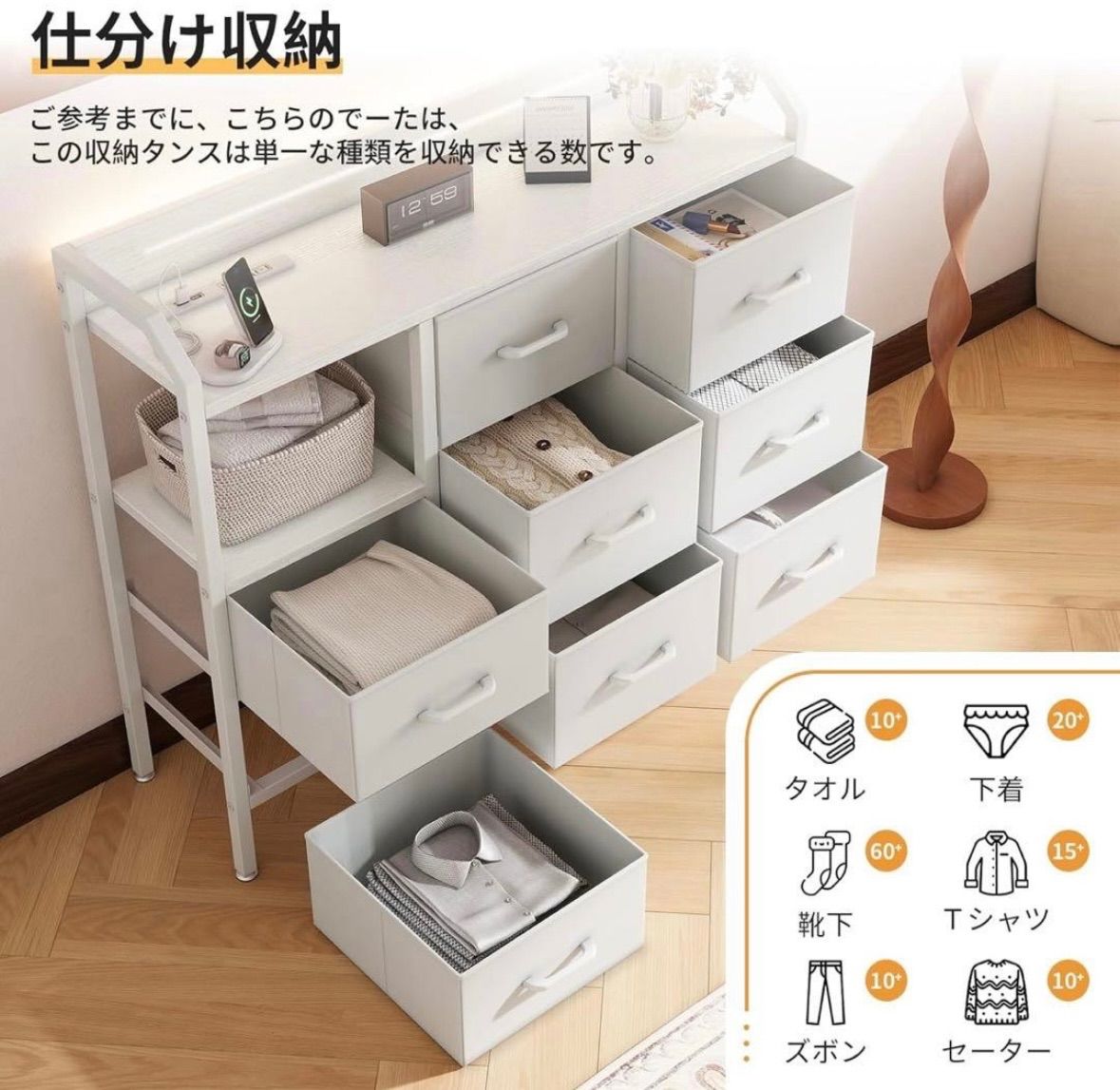 【様々な場所で大活躍】このチェストは、寝室、クローゼット、リビング、子供部屋、廊下、ベッドサイドなど、どんな場所にもぴったりです。木製天板にはランプや花瓶などの装飾品を置くことができ、収納力を活かしつつ、部屋全体の整理整頓ができます。