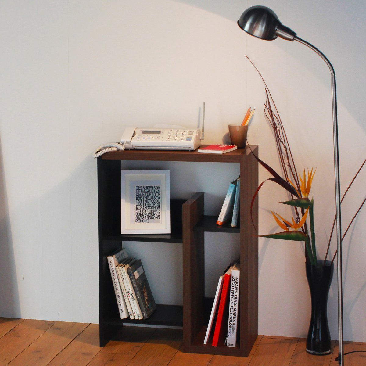 縦置きしたときには、ディスプレイ、本棚、FAX台としてオシャレなスタイルのラックになります。