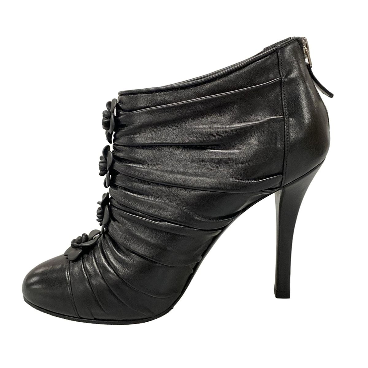 CHANEL シャネル ブーティ 37 1 2 C レディース G 28629 黒 カメリア ココマーク ドレープ アウトソール張替済 レザー