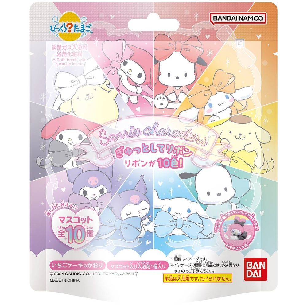 サンリオの人気キャラクター5キャラをそれぞれ2色展開!大ボリュームの全10種展開となっております!入浴剤はいちごケーキの香りで入浴剤が溶けるとピンク色のお湯になります。