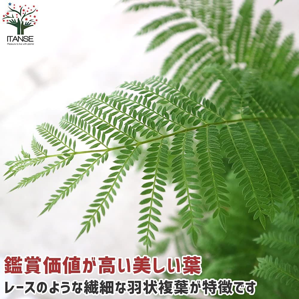 ジャカランタ ミモシフォリア 7号プラスチック鉢【品種で選べる観葉植物/1個売り】学名:Jacaranda mimosifolia/ノウゼンカズラ科ジャカランダ属/半耐寒性落葉中高木/耐寒性:-3℃位まで/原生地:熱帯アメリカ●室内に置きっぱなしにすると日照不足で生育不良になるため、温度のある季節はできるだけ戸外で管理します。冬は落葉します。原生地の南アメリカや九州南部などでは庭木や街路樹として植えられています。大きく成長すると紫色の花を咲かせます。大きく成長しないと開花しないため、レースのような繊細な羽状複葉の観賞向けです。冬季は鉢植えにして室内で鑑賞しますが、関東以南の暖地では防寒すれば露地植えも可能です。【※造花ではありません。生きている観葉植物です。出荷タイミングにより、鉢の形や鉢色が変わる場合があります。商品の特性上、背丈・形・大きさ等、植物には個体差がありますが、同規格のものを送らせて頂いております。また、植物ですので多少の枯れ込みやキズ等がある場合もございますが、あらかじめ、ご了承下さい】