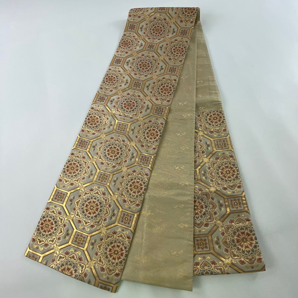 袋帯 秀品 蜀江文 華文 金糸 箔 ベージュ 六通 正絹