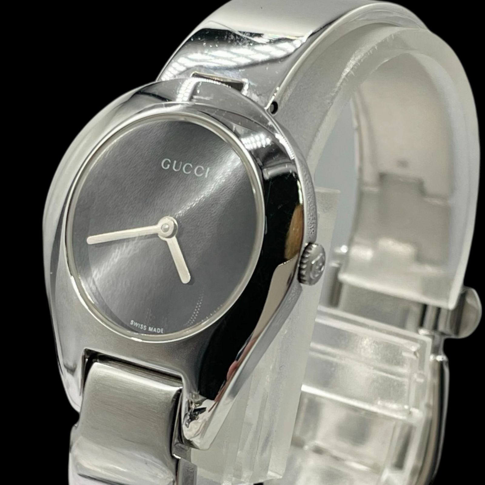 電池稼働 GUCCI グッチ 6700 L 腕時計 リストウォッチ 黒文字盤 バングルウォッチ シルバー SS 有り