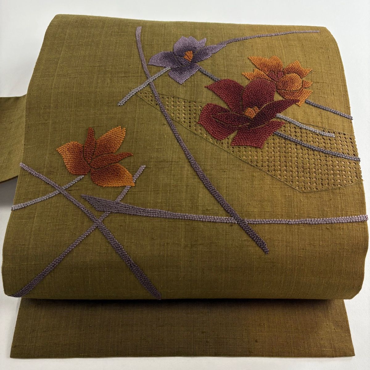 名古屋帯 秀品 紬地 花 刺繍 茶緑色 正絹