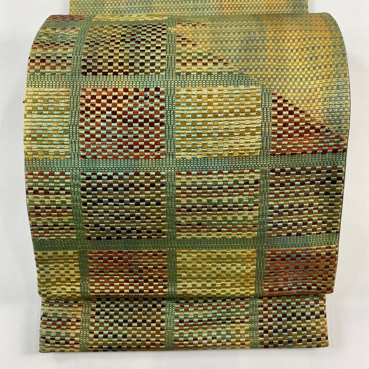 袋帯 秀品 格子 市松 箔 灰緑 お太鼓柄 正絹
