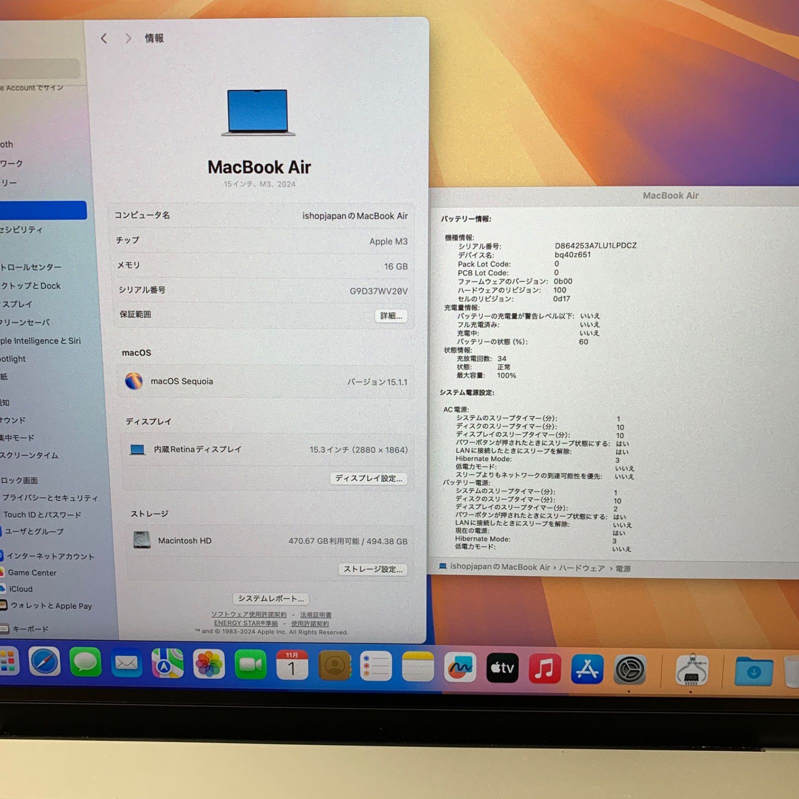 ・Macbook Air M3 チップ 15インチ 2024 シルバー MXD23J/A