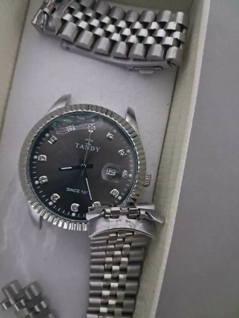 これはダイヤモンドをあしらったタンディな金属製の時計です