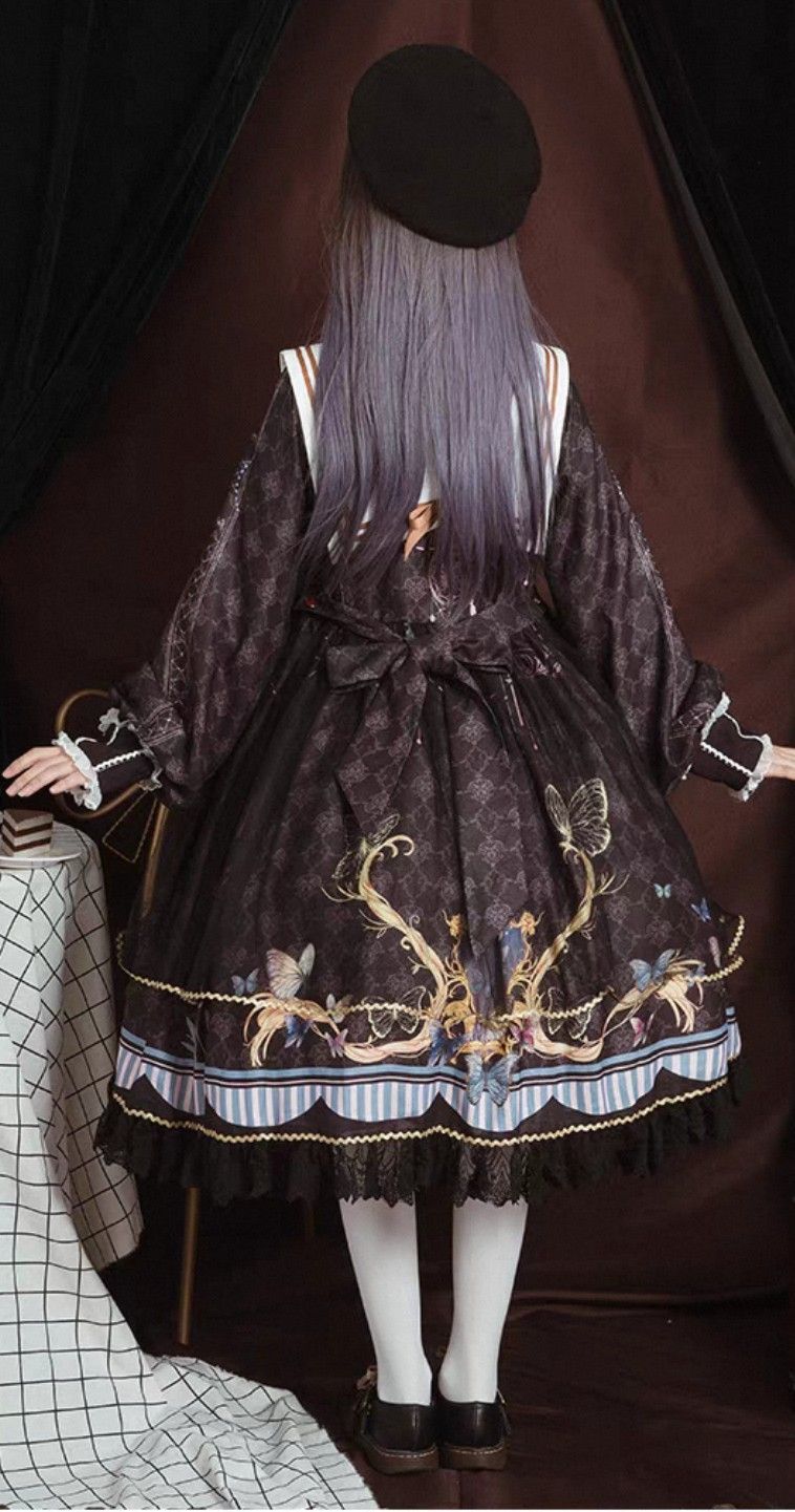 ロリータ クラシカル Lolita ワンピース 蝶柄 リボン OP マリン風 セーラーカラー 紺色 ネイビー 黒 ブラック ロングスリーブ クラシック 宮廷風 プリント ロリィタ ドレス ゆったり 大きめサイズ 界隈