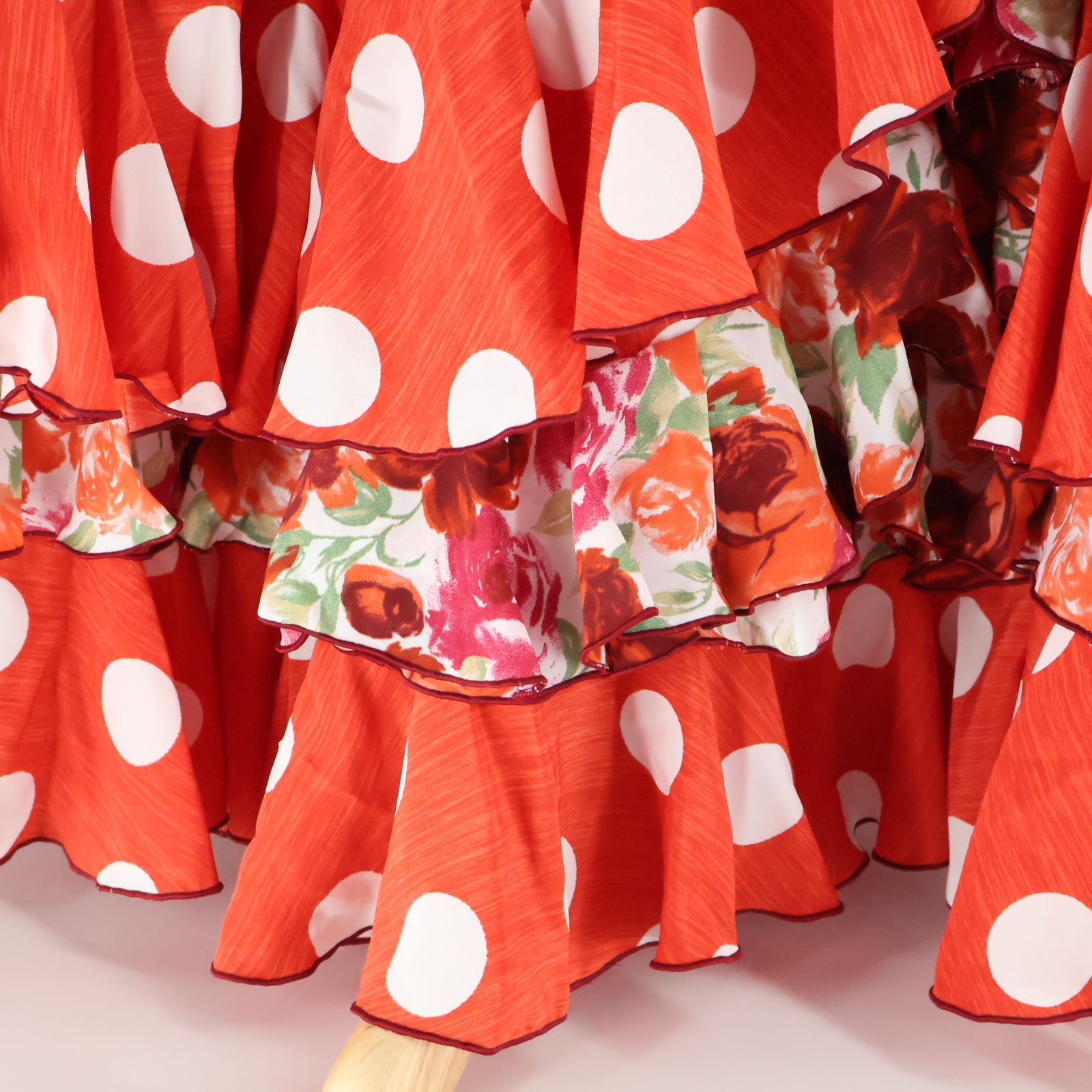 スペイン製 フラメンコ衣装 レッド ワンピース ドレス 赤 ドット 水玉 ボランテ 花柄 リボン 段々 長袖 袖有り 橙 薔薇 ダンス用 レディース 発表会 小さめ 細身 朱色