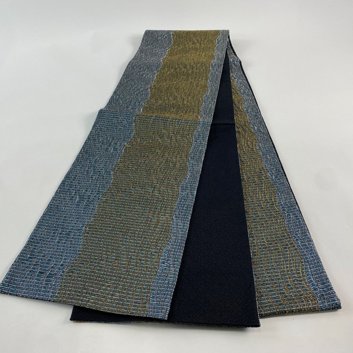 袋帯 秀品 よろけ縞 金銀糸 青緑 全通 正絹