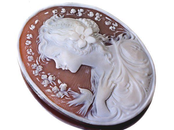 素敵な女性と小鳥を繊細に彫刻で演出した、素晴らしい高級シェルカメオルースです!