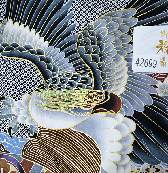 お宮参り 産着 のしめ 男児 男の子 正絹 総疋田柄 豪華絢爛 金刺繍 黒色 鷹 祝着 一つ身 掛け着 熨斗目 NO 42699