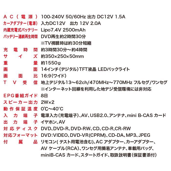 付属品 リモコン( テスト用電池含む)、AC アダプター、カーアダプター、AV ケーブル(RCA)、ワンセグ用簡易アンテナ、車載用バッグ、miniB-CAS カード、スタートガイド、取扱説明書(保証書添付)