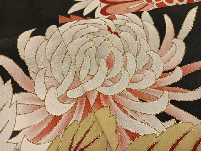 平和屋着物 アンティーク 大正ロマン 刺繍 花尽し 黒地 金彩 正絹 ph