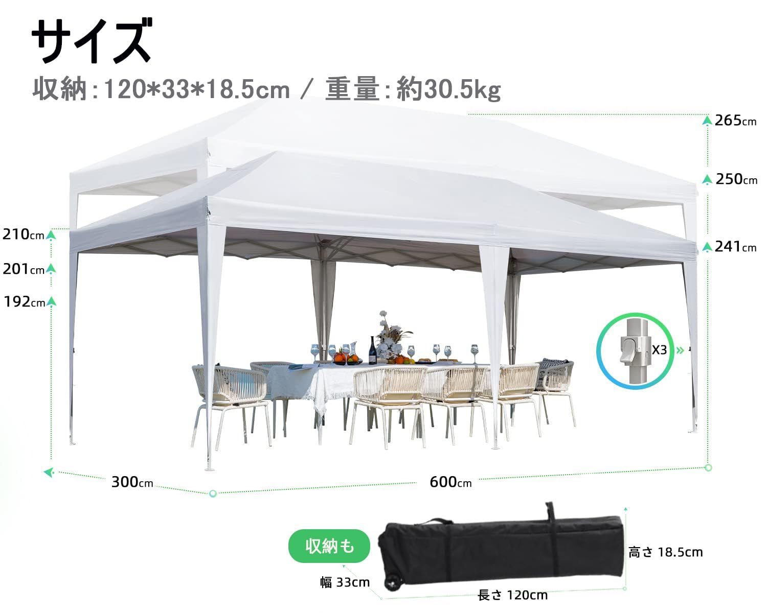 タープテント テント 大型 3 m 6 mUVカット 3段階調節 キャンプ アウトドア 大型テント ワンタッチテント タープ キャスター付きバック 店頭販売 屋外 集会用 車庫 少年野球 サッカー 試合応援 運動会 イベント ホワイト