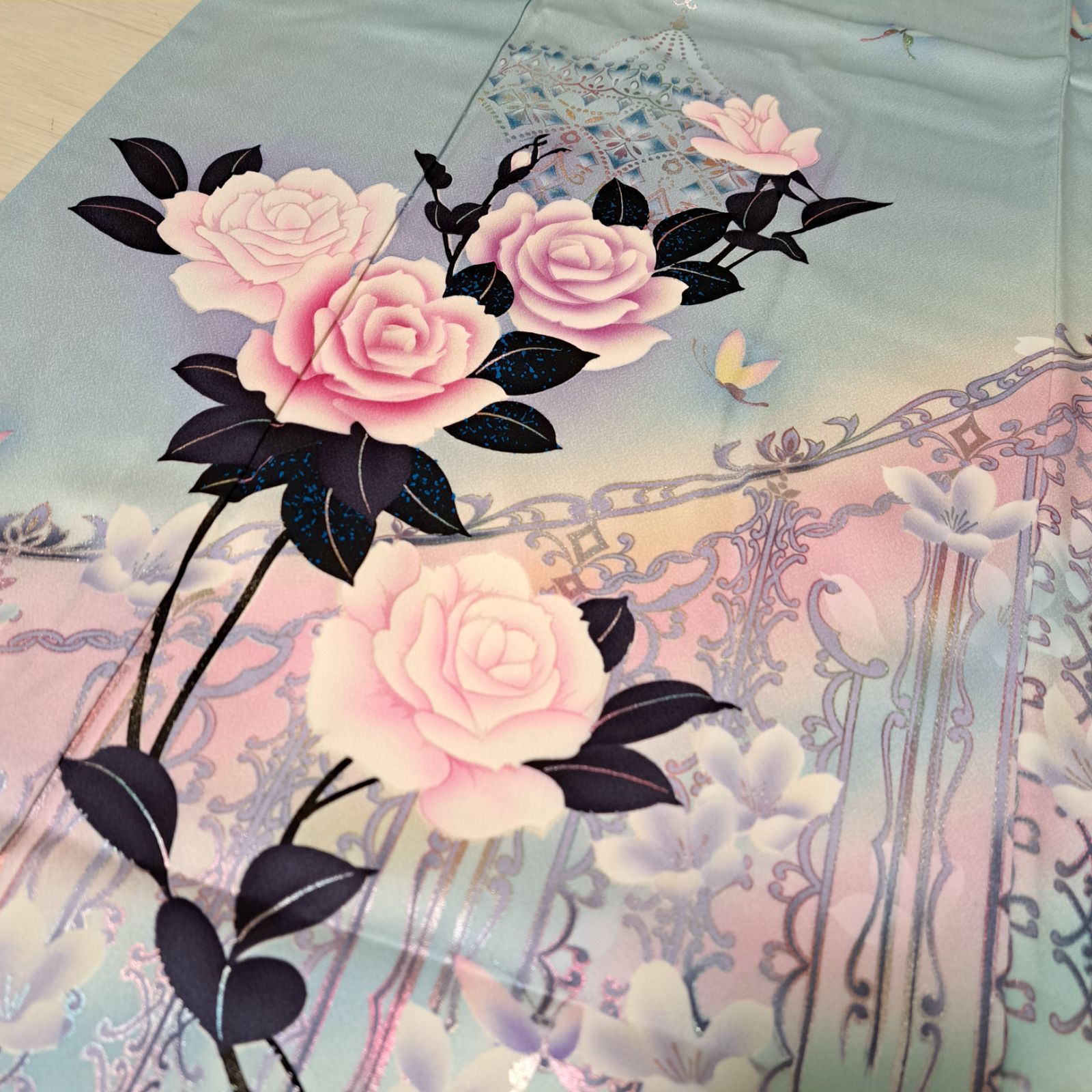 ライトブルー系色に薔薇と蝶のエレガントな、正絹の振袖です。