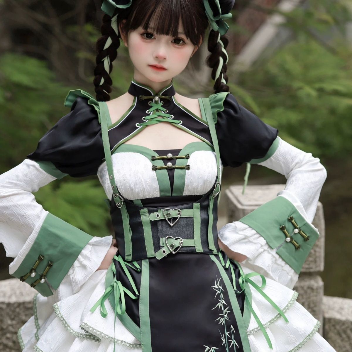 中華風 Lolita連衣裙 旗袍改良 スイート&スパイシー 中華娘風 豪華刺繍入り ドラゴンモチーフ 甘辛デザイン 長袖ワンピース ピンク×ブラック スカート付き コスプレ衣装 特