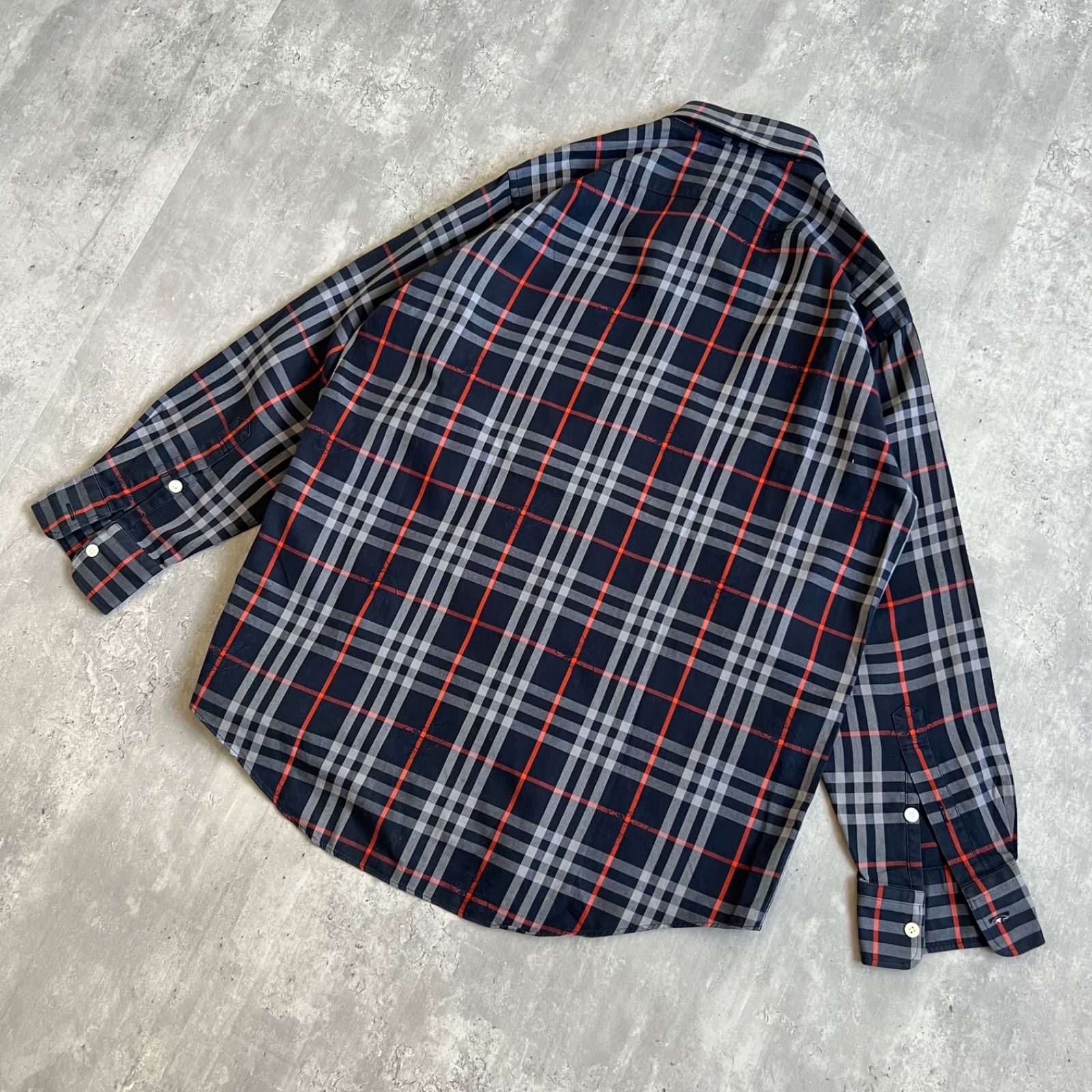 90 s Burberry バーバリーズ シャドウホース総柄 バーバリーチェックシャツ Navy × Orange LサイズWJO 48-141