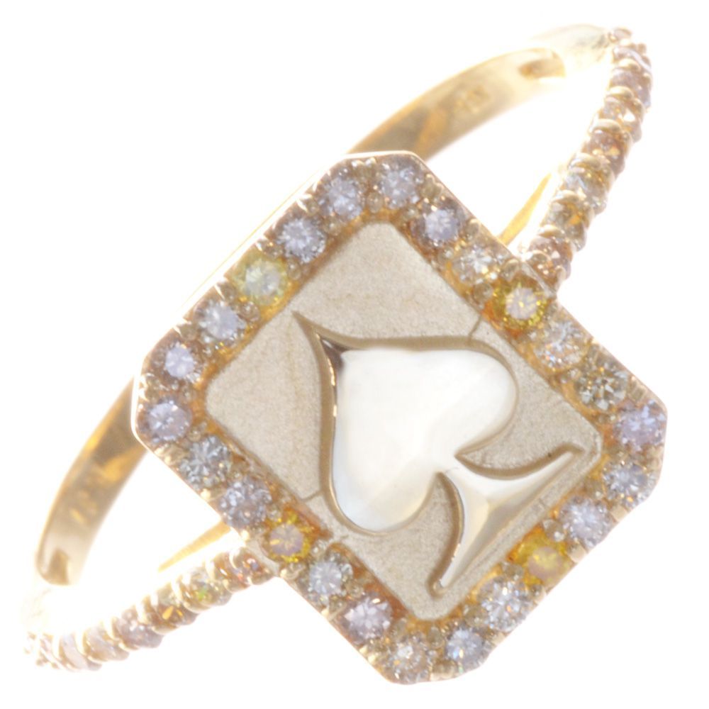 18金を使ったトランプモチーフのリングです。スペードモチーフのカードの淵とリングアームにダイヤモンドを敷き詰めました。無色とブラウン~イエロー系のダイヤを使い分けて配置し遊び心を感じるデザイン。男性はピンキーリングとしての使用がお勧め。女性もお召しになれます。