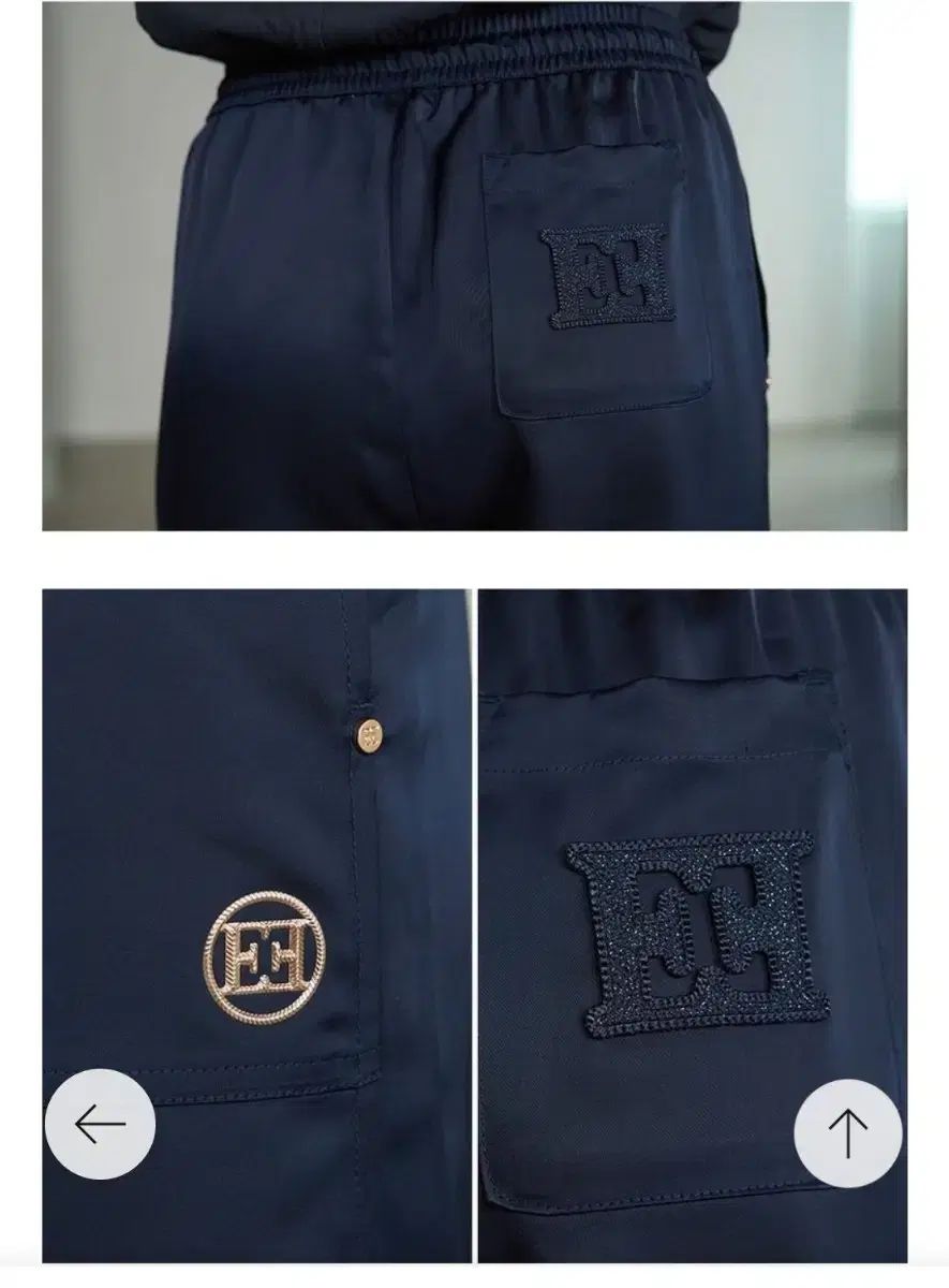 白の模様とワイドパンツネイビーブルーのTシャツです