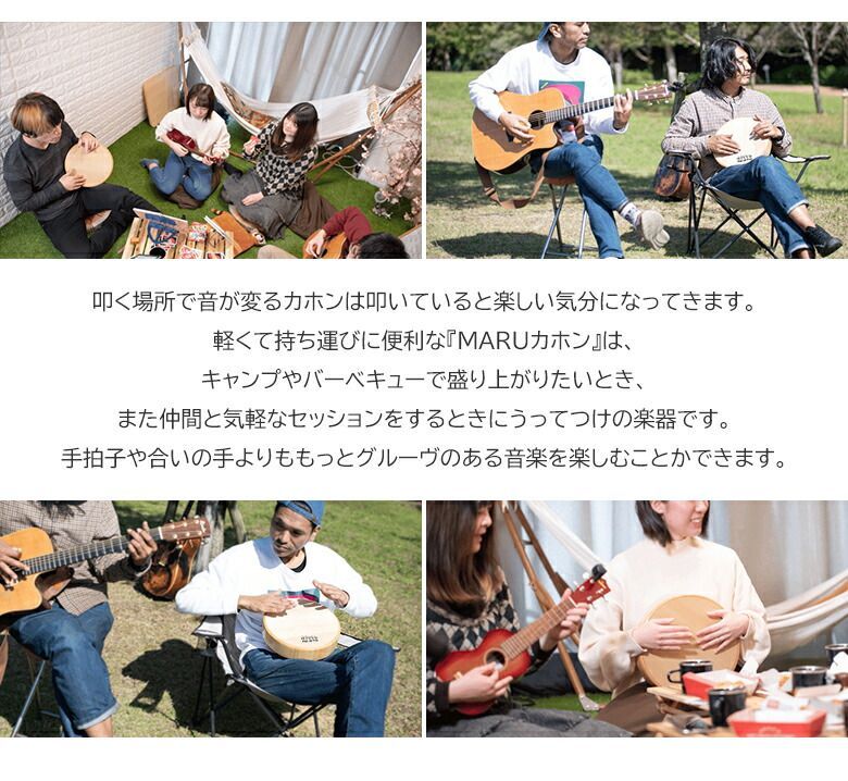 初心者も自由に楽しめる!『MARUカホン』は、心地よいヒノキの手触りの新感覚楽器です。軽くて持ち運びに便利な『MARUカホン』は、小さく見えても存在感あるサウンドで、キャンプやバーベキューで盛り上がりたいとき、また仲間と気軽なセッションをするときにうってつけの楽器です。手拍子や合いの手よりももっとグルーヴのある音楽を楽しむことかできます。『MARUカホン』でヒノキ生まれの心地よいサウンドをお楽しみください。