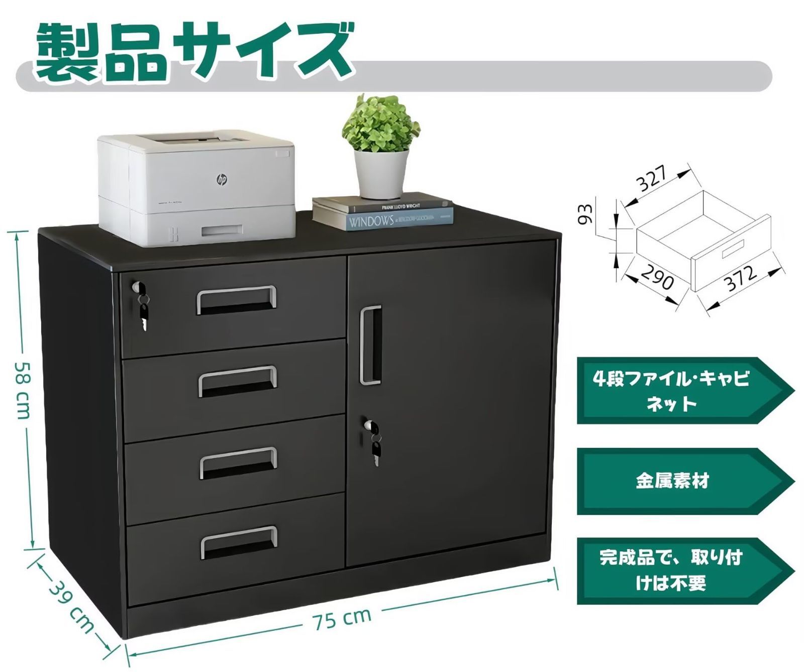 EastEamily オフィスキャビネット ファイル収納キャビネット 4段 75×39×58.5cm 調節可能 仕切り サイドワゴンキャビネット 鍵付き スチール製 袖机 机下収納 組立て不要 オフィス 事務所 更衣室 学校 業務用(ブラック)
