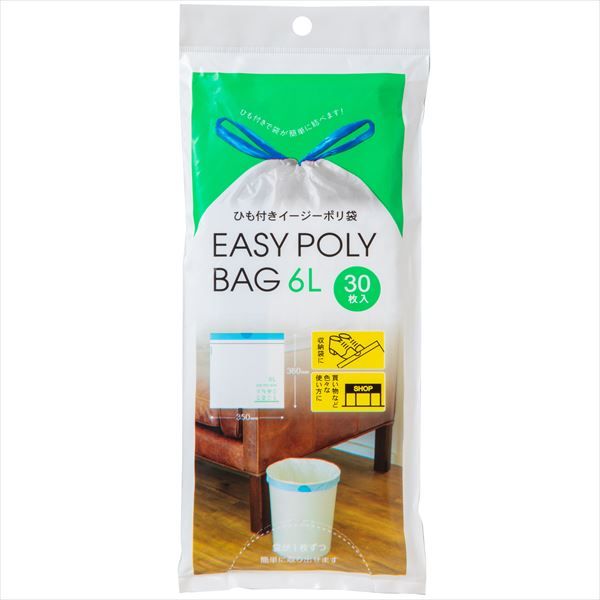 ・ひもがついたポリ袋。袋が簡単に結べます。・結び目のロスが少ないため容量いっぱいに使用できます。・ちょっとおしゃれな印刷付き。【6L用:室内ペールのゴミ袋として。収納袋、買い物袋として。】