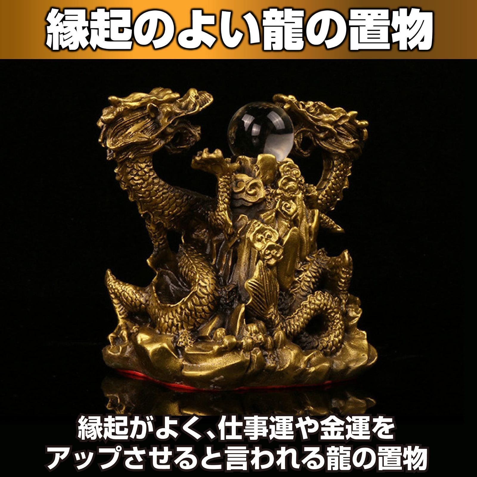 天に向かって運を上昇させる龍の置物:運を乗せて天に昇ると言われる龍の置物です。銅製で重厚感あるゴールドカラーの龍の置物は風水のご利益だけでなく、存在感もあります。玄関から入って右側に飾ると良いと言われていますが、床の間などに飾るのもおすすめです。