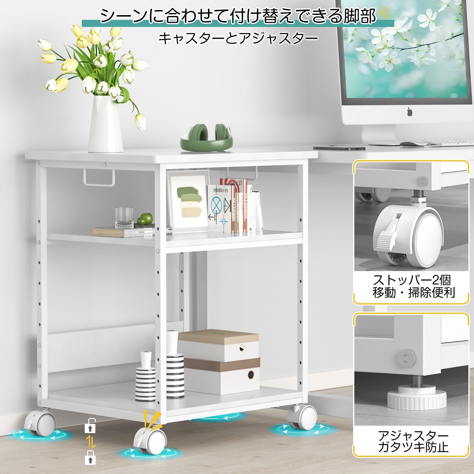 プリンター台はお客様のご使用シーンに合わせてアジャスターとキャスター両方が両方ついております