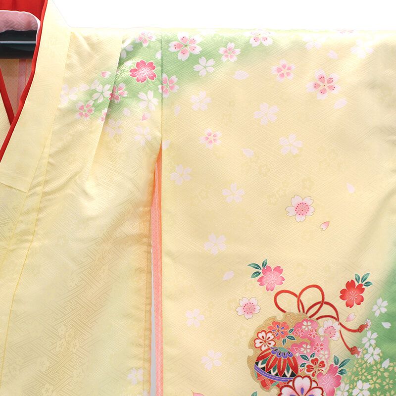 優しい薄黄色に、緑に桜の柄が流れる伝統文様のお子様着物。