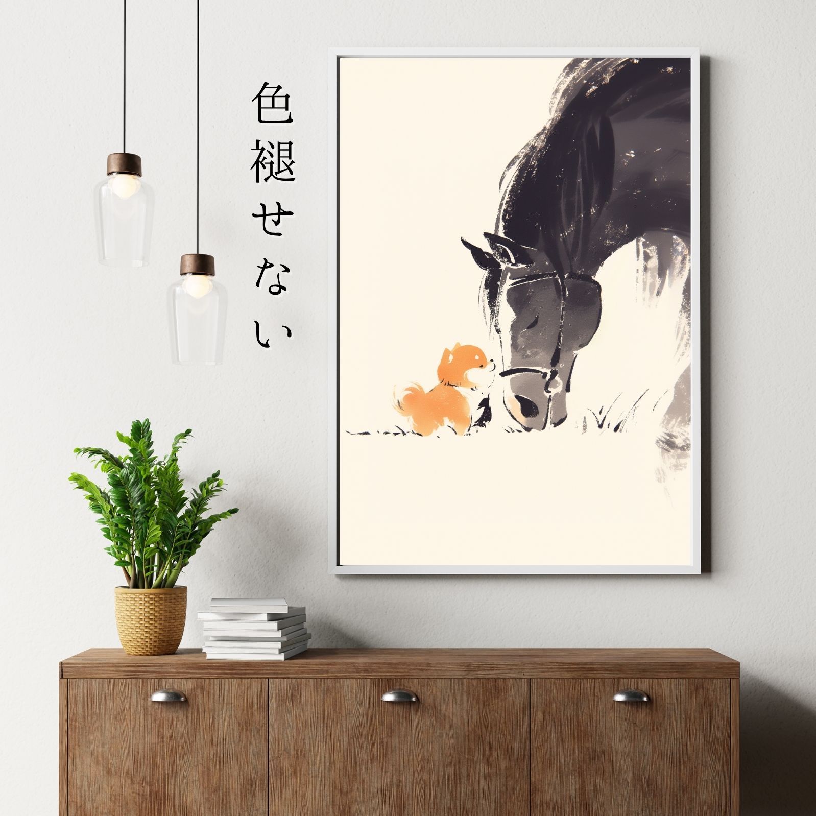 干支の午(馬)とキュートなポメラニアン犬が、とてもかわいいアートポスター作品に仕上がっています。